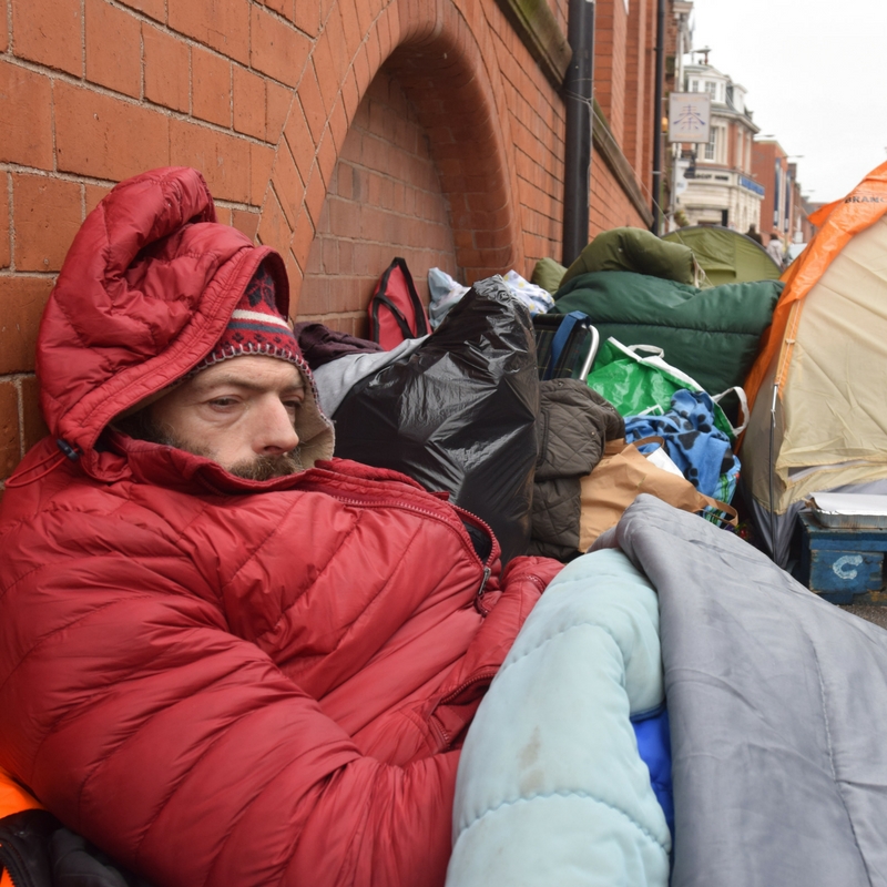 Walking past Leicester’s main shopping centre, I saw that homeless people had set up camp on the street nearby.